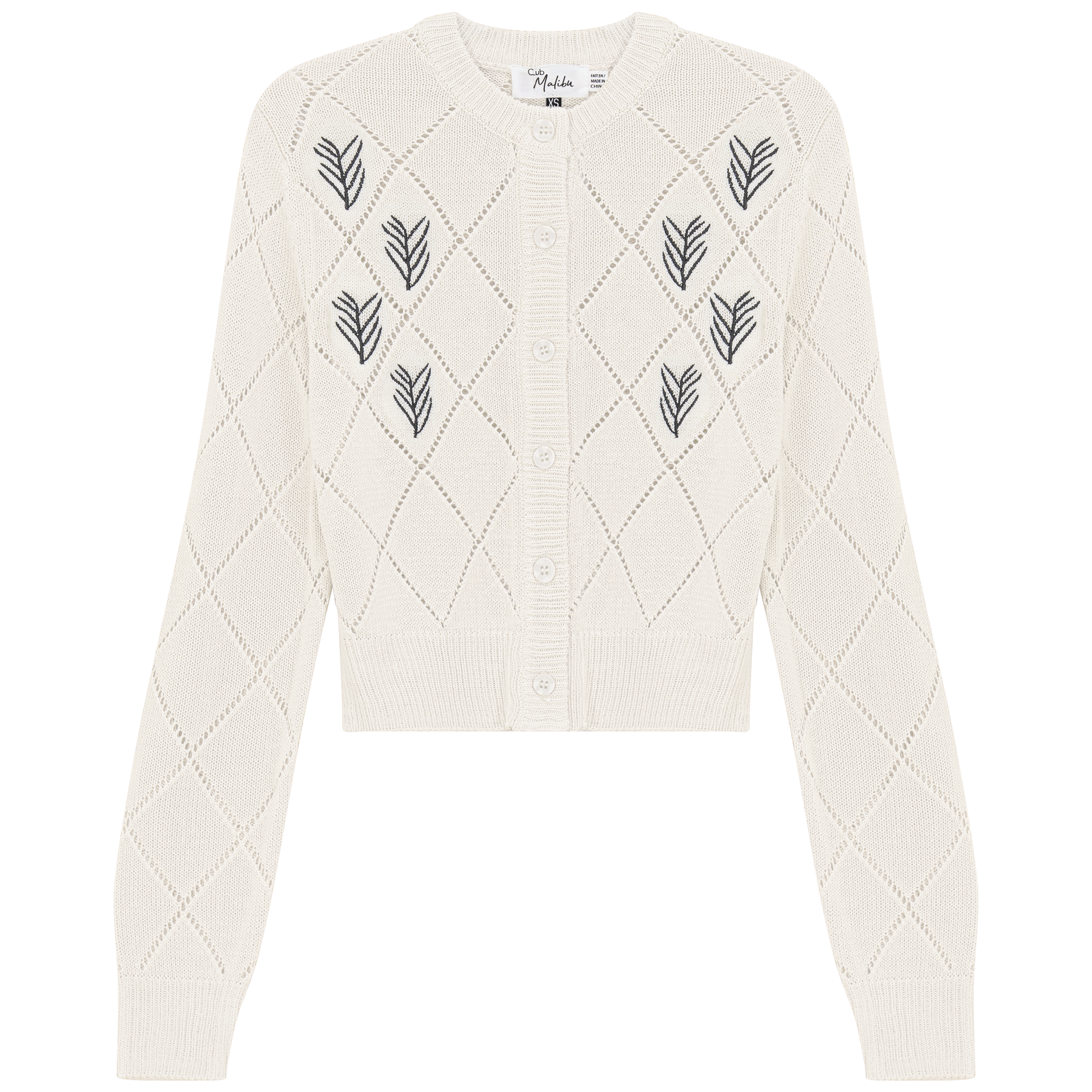 Ladies cropped crochet knit cardigan with leaf embroidery at front, center front button opening with ribbed neckband and hem.ֲ