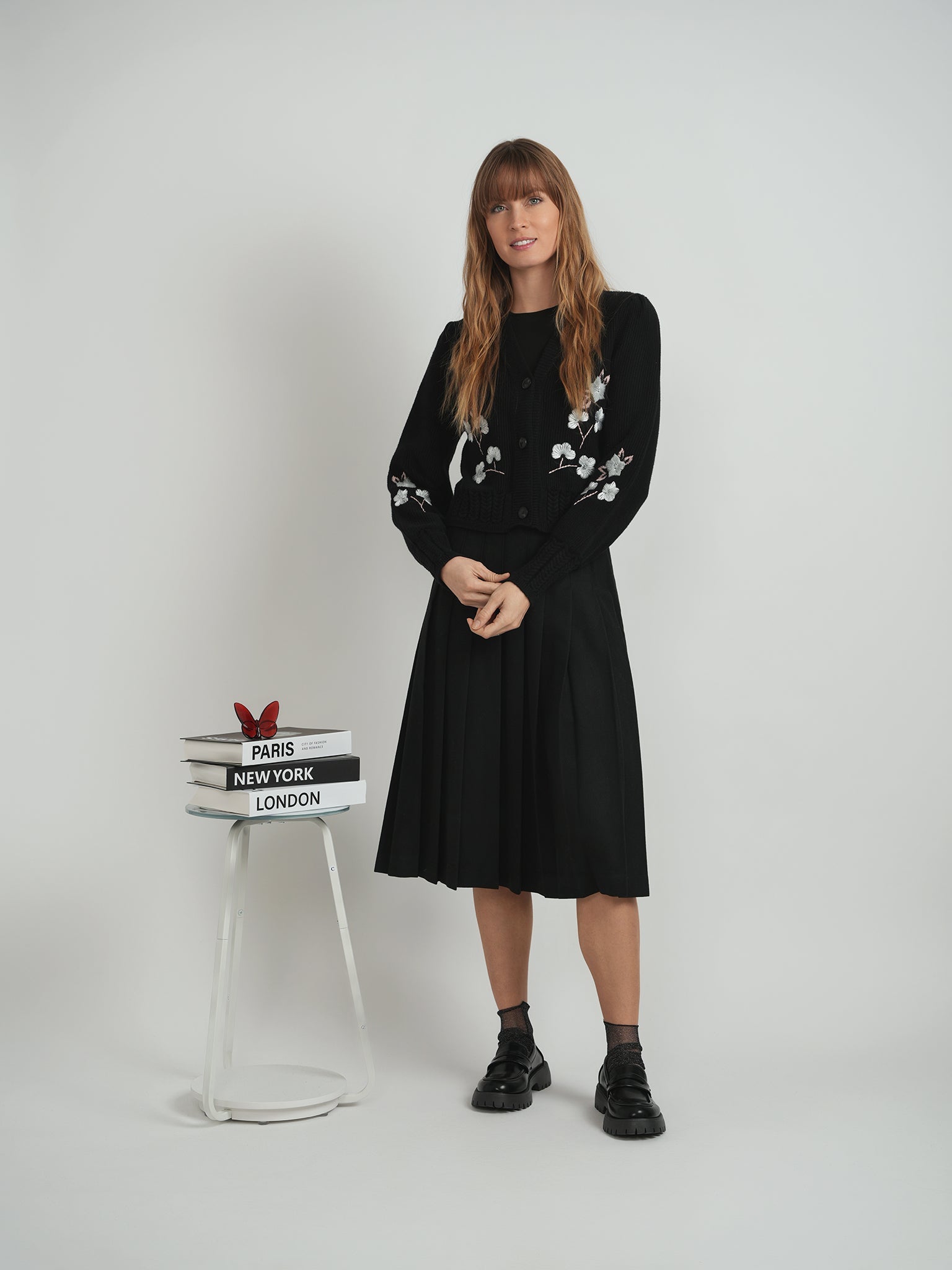 Ladies cropped knit cardigan with floral embroidery and center front button opening. ֲ