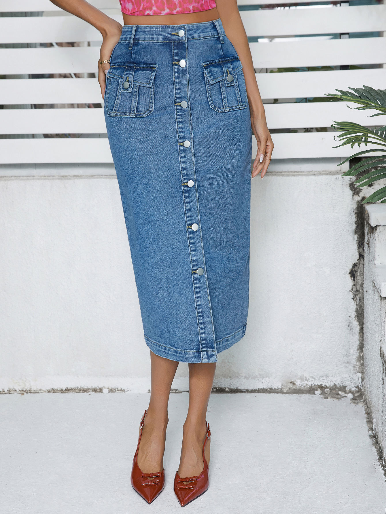Multi Breasted Mid Length Hip Skirt Women Stretch Denim Pencil Skirt