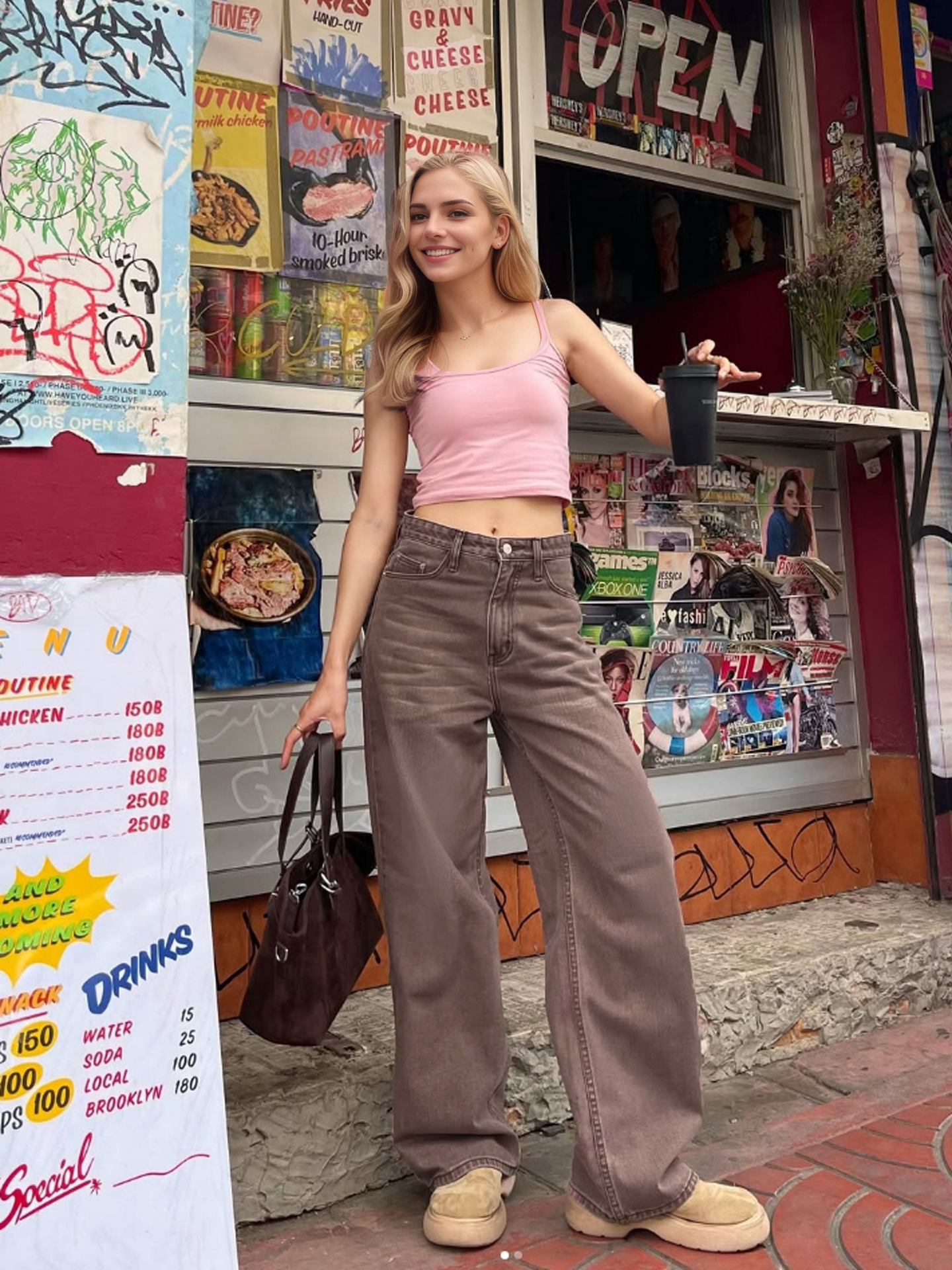 Non Elastic Wide Leg Three Dimensional Cat Beard Denim Candy Color Brown Colored Trousers
