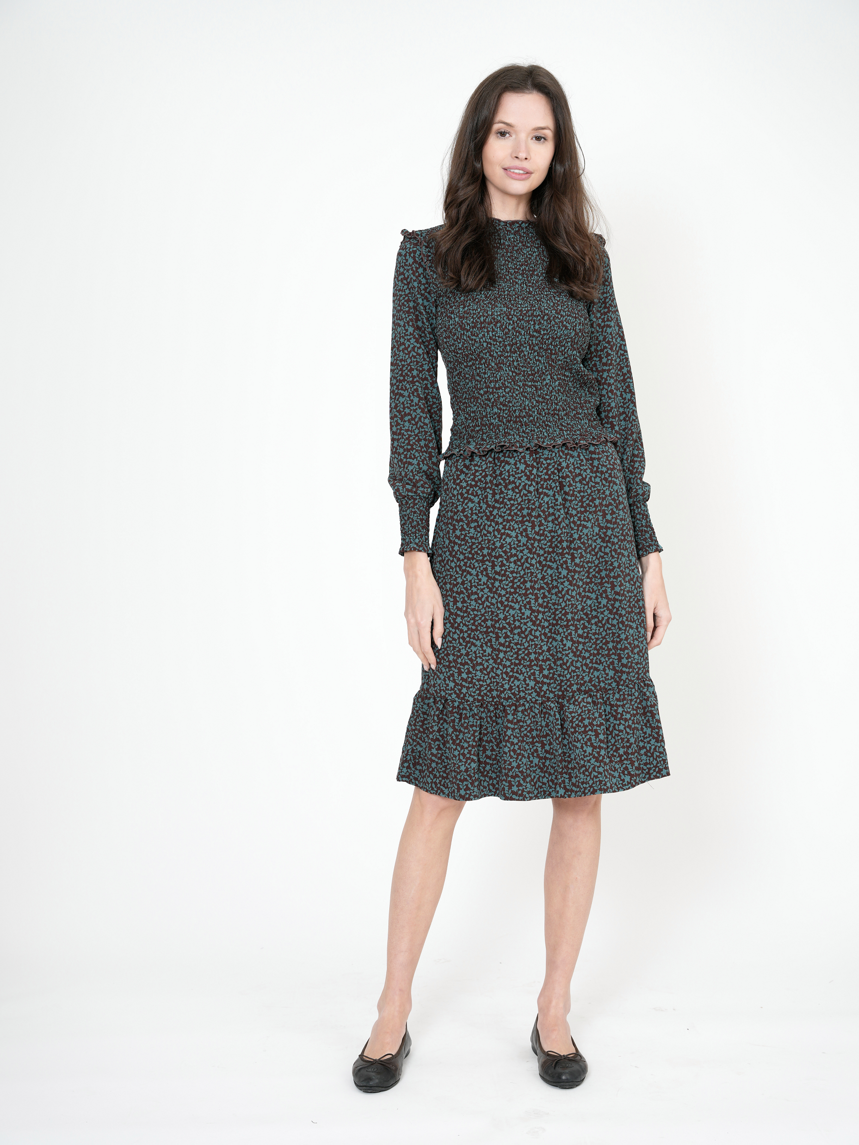 Teens small flower all over print. Long sleeves top with smocked detail at top front and cuffs with zipper at center back. Matching skirt with zipper at center back.ֲ