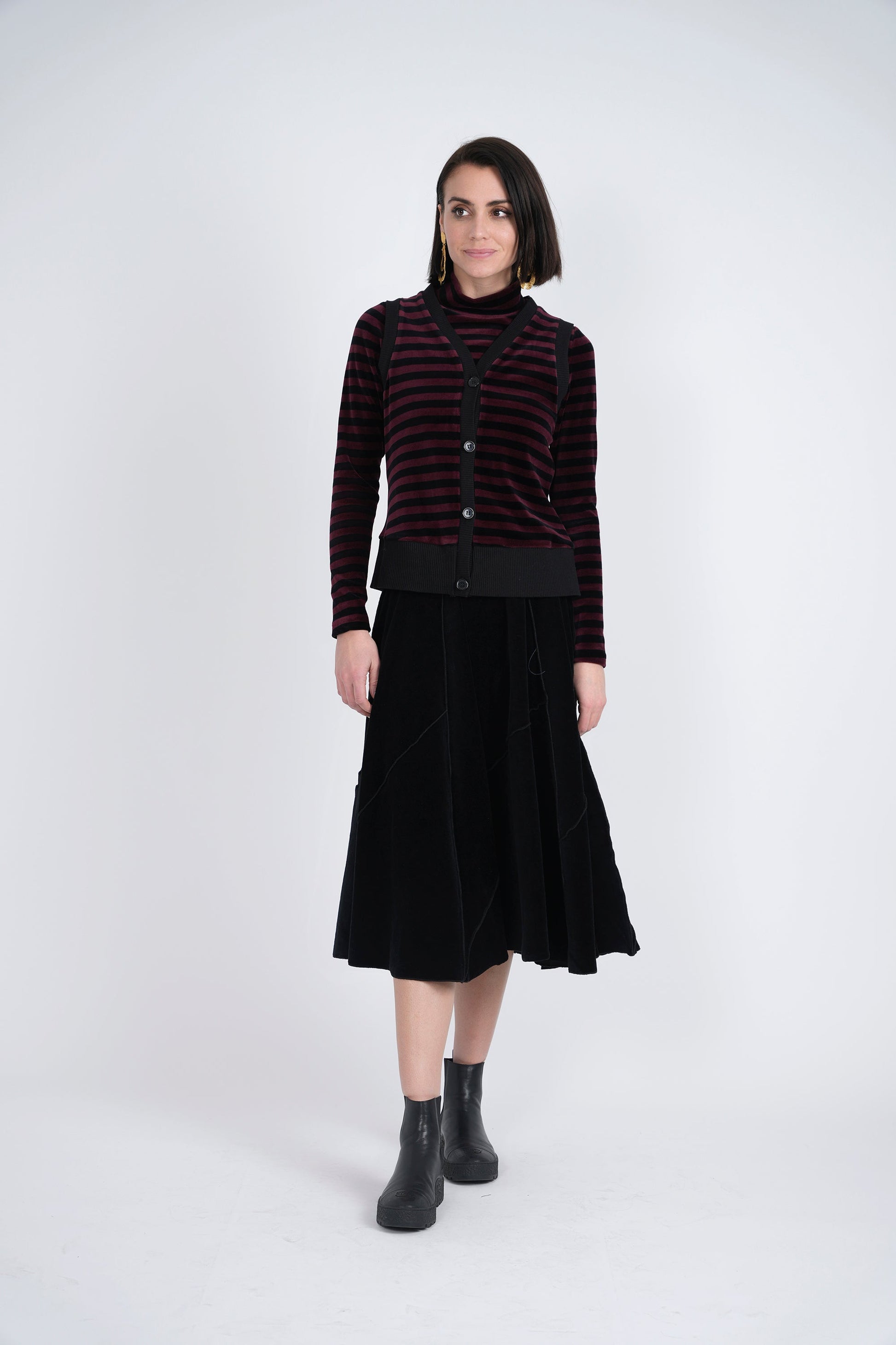 Ladies cotton velour stripped velour vest with ribbed armholes and placket with button closure at center front. ֲ