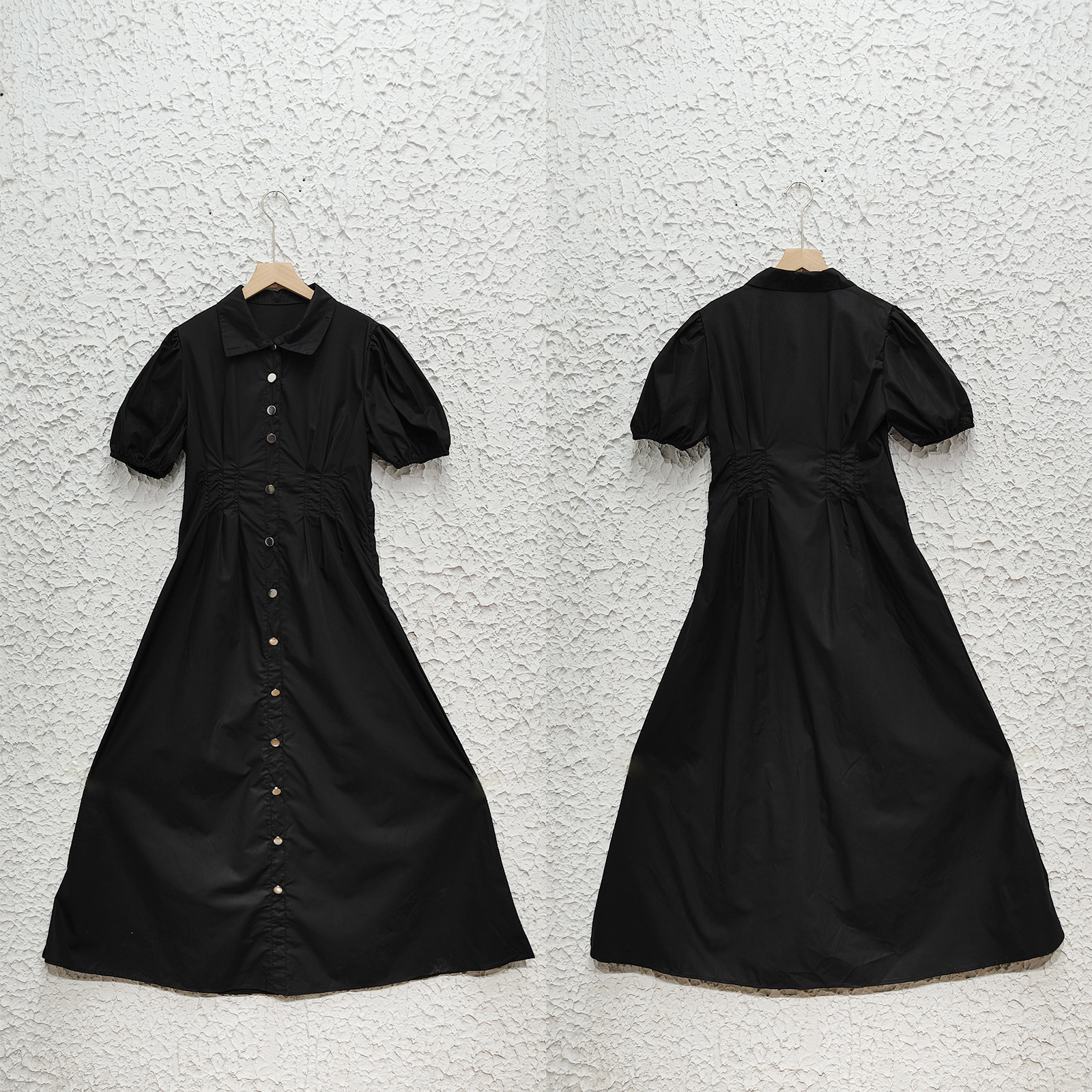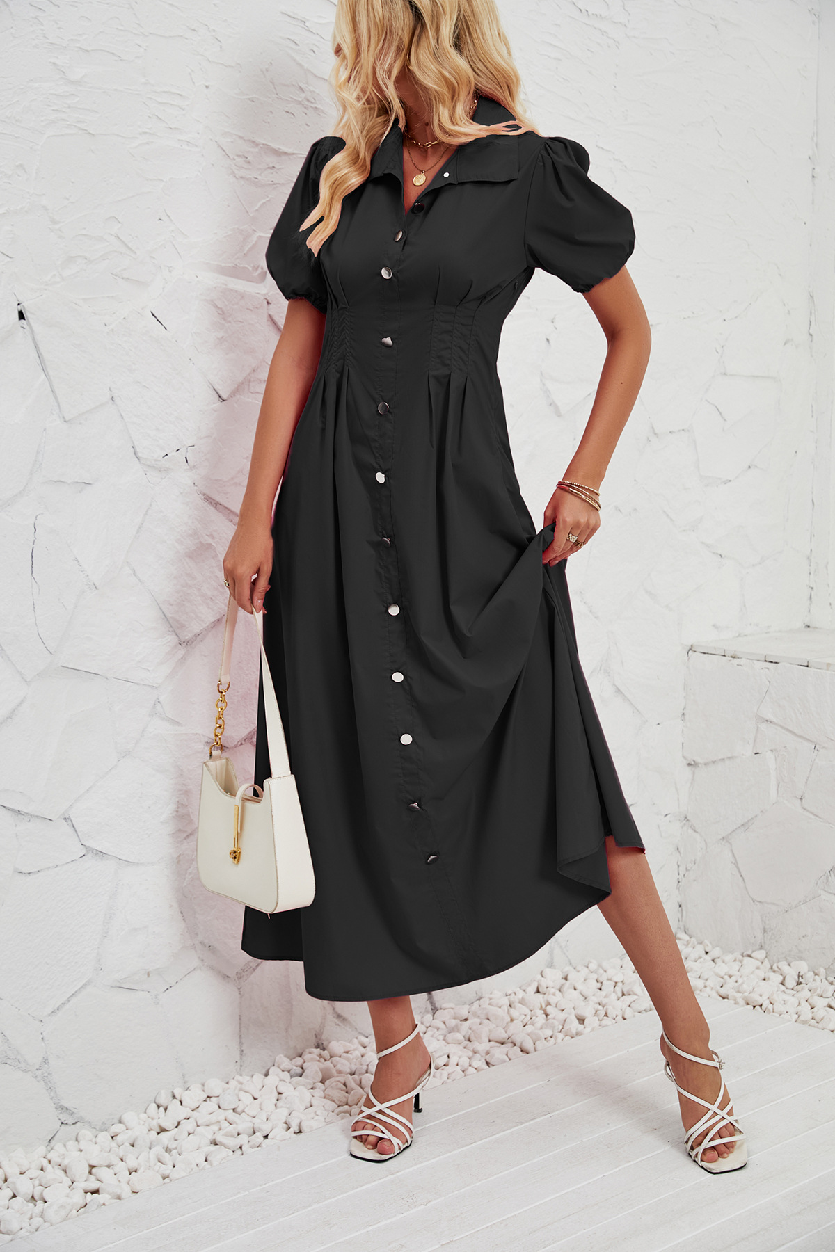 Summer Solid Color Elegant Slim High Waist Tight Waist Button Mid Length Dress Women